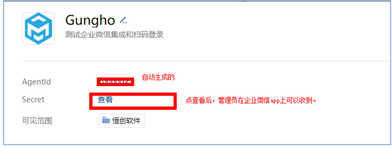 進入管理后臺-> ?? 應用管理,點擊剛創建的應用 這里的agentid: secret? 就是準備材料中說的第二步材料