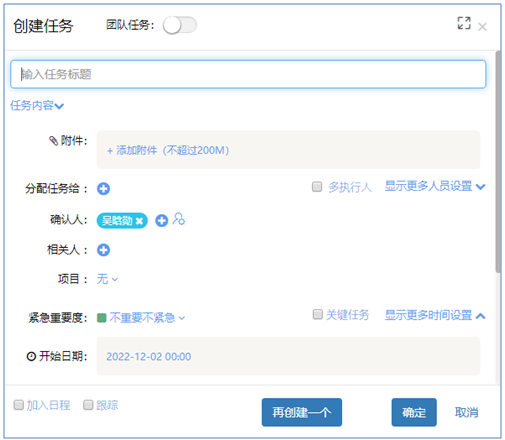 - 任務執行人也可以是一個部門,這樣創建的任務是一個部門任務,當你需要給一個部門派個任務的時候又不清楚給這個部門的具體人員,可以直接給這個部門分配任務。