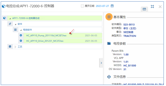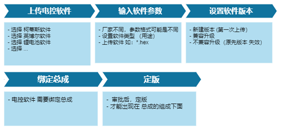 1)電控軟件上傳時需設置參數、版本、hex文件、用途、綁定的總成物料號等;