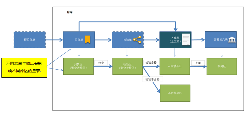 - 收貨單生效后就可認為增加倉庫量,貨物的狀態(tài)ITEM_STATE 為空(注意空也是一種狀態(tài),表示未知)。從倉庫管理的角度來說,收貨后貨物的管理權就在倉庫,因此,我認為上圖中的所有庫區(qū)都在倉庫管理的范疇??梢栽黾?lt;到貨區(qū)>的存儲量。倉庫中可以創(chuàng)建一些類型為:到貨區(qū)、檢驗區(qū)、上架區(qū)、不合格品區(qū)等庫區(qū)(需要在庫區(qū)Area加類型)。這些不是Zone(說明一下,Zone在我們的WMS里是邏輯庫區(qū))。在創(chuàng)建上面的這些單據(jù)的時候,必須選擇一個匹配的庫區(qū)(如果倉庫只有一個這些類型的庫區(qū),不需要選,直接匹配上),檢驗單需要選兩種類型的區(qū)域。