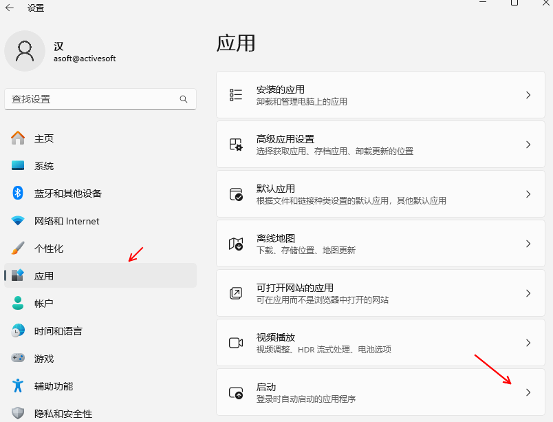 根據(jù)設(shè)置一的步驟,使用同樣的方法,找到“應(yīng)用”和“啟動(dòng)”選項(xiàng)