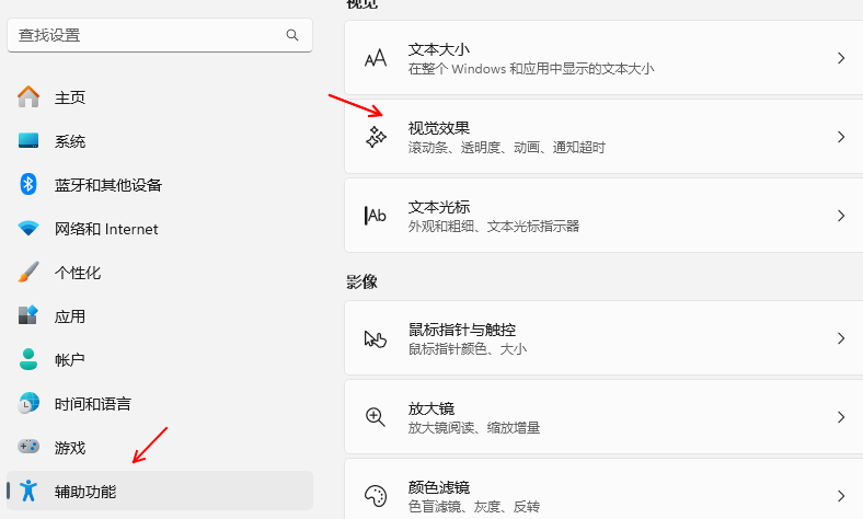左側(cè)菜單選擇“輔助功能”,右側(cè)選項(xiàng)中找到“視覺效果”,通過關(guān)閉透明效果和動(dòng)畫效果,你可以減少系統(tǒng)的視覺負(fù)擔(dān),提高電腦的響應(yīng)速度和流暢度。