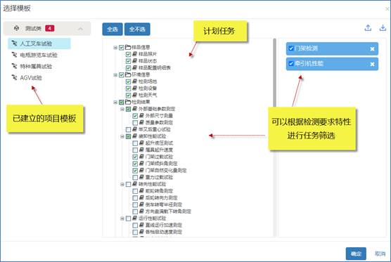 針對上圖:我們選擇了人工叉車試驗(yàn)這個模板,若全選,那么就是對叉車整車做檢測了。但又的時候甲方并不是整車而是某幾個部件,所以,系統(tǒng)也支持通過特征選項(xiàng)的方式來對計劃任務(wù)進(jìn)行篩選。 篩選完成后確定,就能生成新的測試項(xiàng)目。