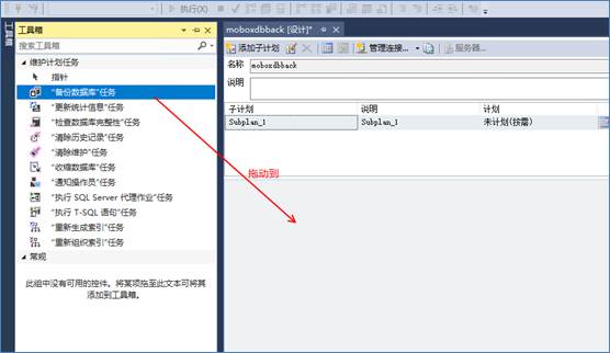 3、點擊上方欄的工具箱,選擇“備份數(shù)據(jù)庫任務”,用鼠標左鍵點住并將其拖到右側空白處,然后雙擊該任務