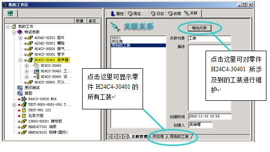 ? ? ? 當設計人員完成了一個零部件的設計后,其它管理人員可以在”共好”上完善該零部件和工裝等管理信息之間的關聯關系,見下圖: