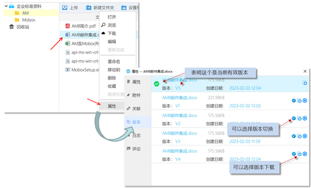 版本管理是一個非常重要的功能,在文檔中心及部門共享內(nèi),文檔柜里面同名文件多次上傳后會產(chǎn)生版本,可以設置哪個版本為有效版本 ,可以按需下載歷史版本