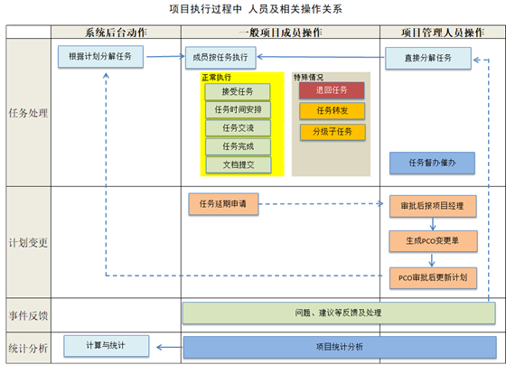 當項目計劃審批通過正式生效后,該版本的項目計劃就處于執行狀態。Gungho系統后臺會根據項目計劃自動分解計劃任務。這些任務會分派到對應的執行人。執行人收到任務后,可以對任務進行處理。項目成員若發現問題可以在項目內進行問題反饋(任務管理、反饋管理怎樣處理,在后面內容詳細介紹)。