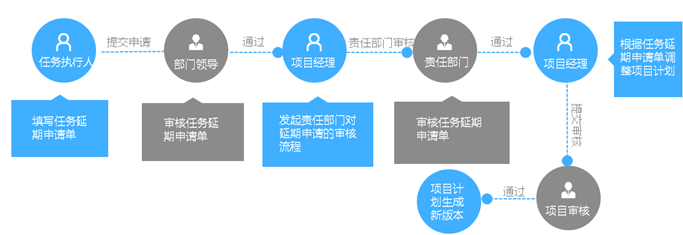 復雜計劃變更流程是一個比較嚴謹的計劃變更過程,首先計劃的變更肯定是由某一個任務或多個任務的延期造成計劃無法滿足預期,需要變更。因此,首先任務的執行人提出任務延期申請,并說明原因、指出造成延期的責任部門,要求延期多少天。這些申請首先會到執行人所在的部門,得到部門負責人的認可,然后這些申請才會到項目經理。由項目經理發起多部門的延期任務申請確認,通過后由項目經理根據任務延期申請單里的信息改進項目計劃,然后走審核流程通過后項目計劃變更完成