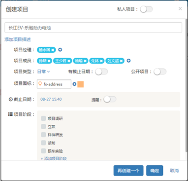 項目名稱、項目內容描述、項目周期、項目經理、項目成員、項目階段、項目內權限配置、項目內相關審核流程配置等。設置好后,保存后項目建立。項目成立后系統會通過我們的企業內部通訊系統項項目成員發送消息進行提醒。