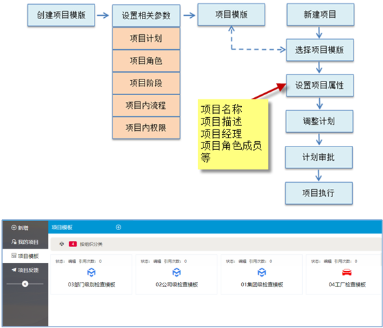 有些企業項目實施相對比較規范或標準,其項目計劃、相關權限設置、流程設置、階段設置等都非常相似。新項目可能主要就變更了一下人員。這類項目,我們實現可以建立項目模版,在項目模版內將項目核心參數(如:項目計劃、項目權限、階段等)都先建立好,生成項目模版。新項目的時候,可以通過套用項目模版來新建項目。