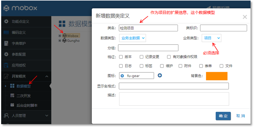 因為,我們是為Gungho的項目管理做配套,所以在mobox建立數(shù)據(jù)模型的時候,有類型需要選擇? ,業(yè)務(wù)類型必須是 “項目”
